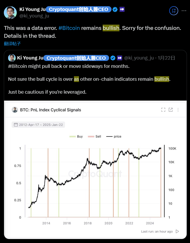 久币网 消息,1 月 24 日,Cryptoquant 创始人兼 CEO Ki Young Ju 发文在 x 发文称,此前发布的数据存在错误,强调比特币市场仍然保持看涨。