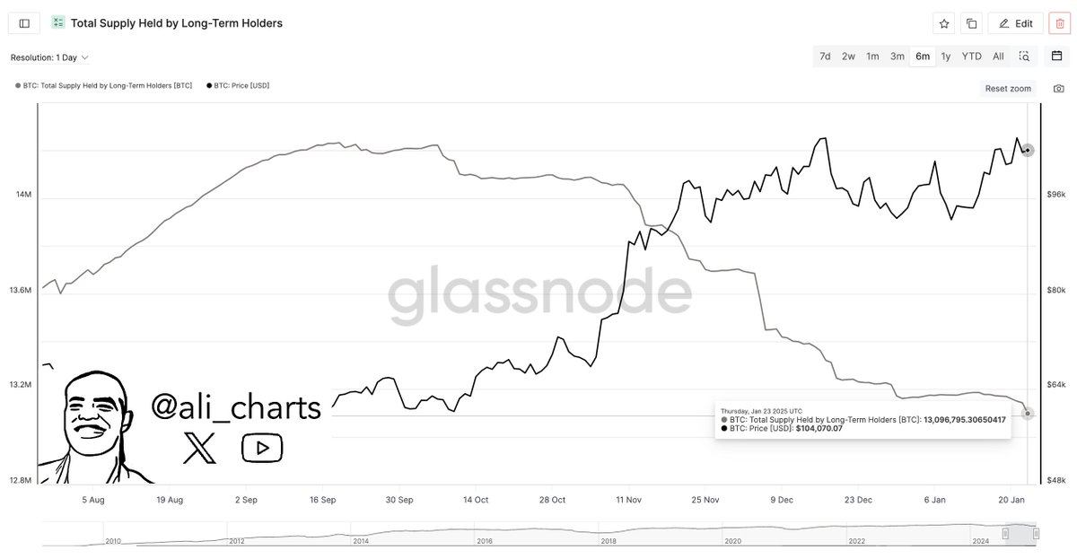 久币网 消息,1 月 26 日,据链上分析师 @ali_charts 监测,比特币长期持有者的总持仓量在过去一周内减少了超过 75,000 BTC。