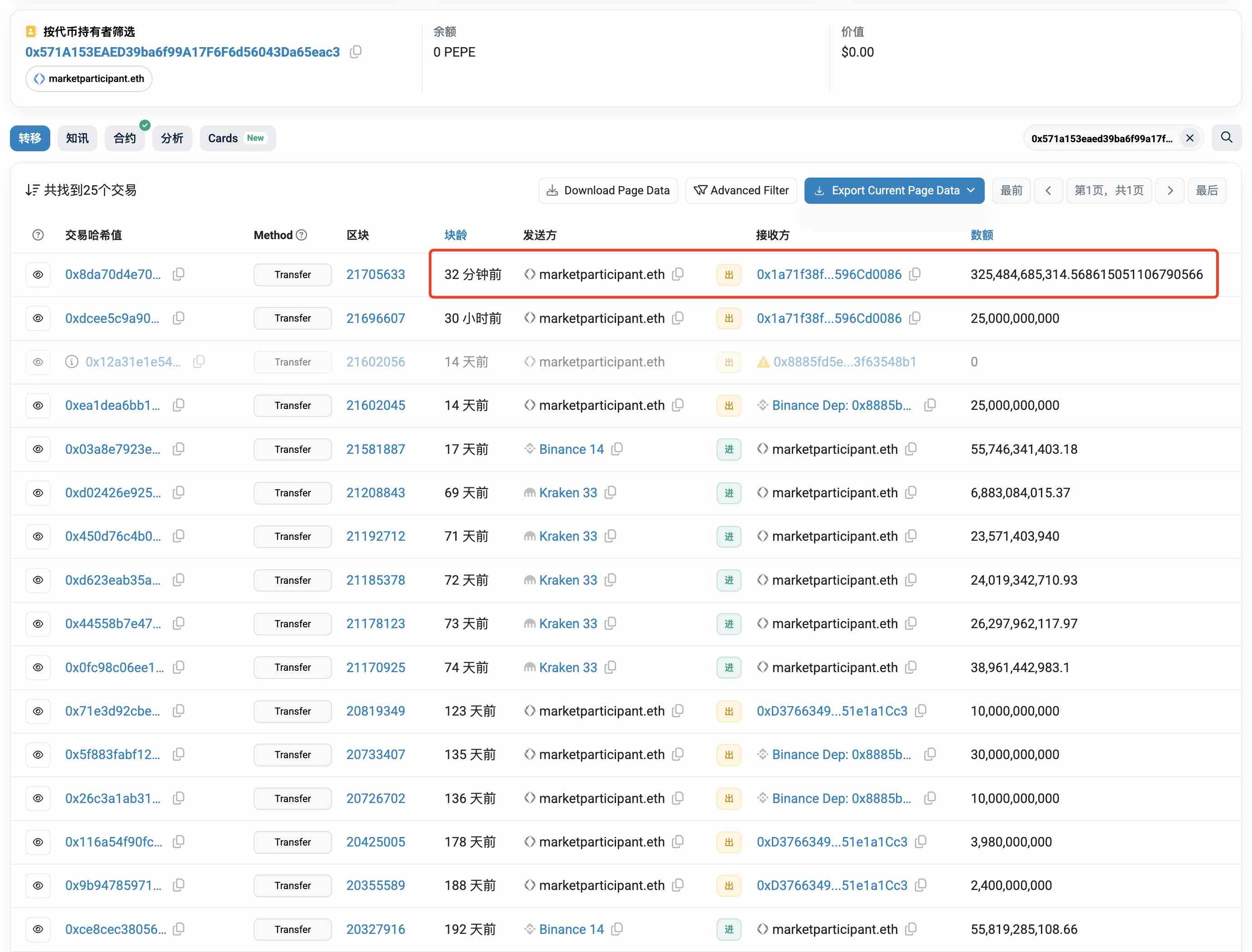 久币网 消息,1 月 26 日,据 @EmberCN 监测,地址为 marketparticipant.eth 的大型持币者将其持有的 3254.8 亿枚 PEPE 转入至币安,价值约490万美元。