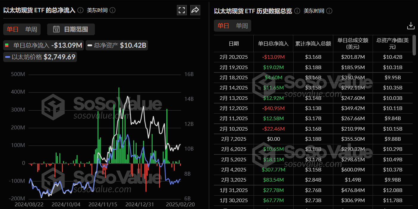 久币网 消息,根据 SoSoValue 数据,昨日(美东时间 2 月 20 日)以太坊现货 ETF 总净流出 1309.15 万美元。