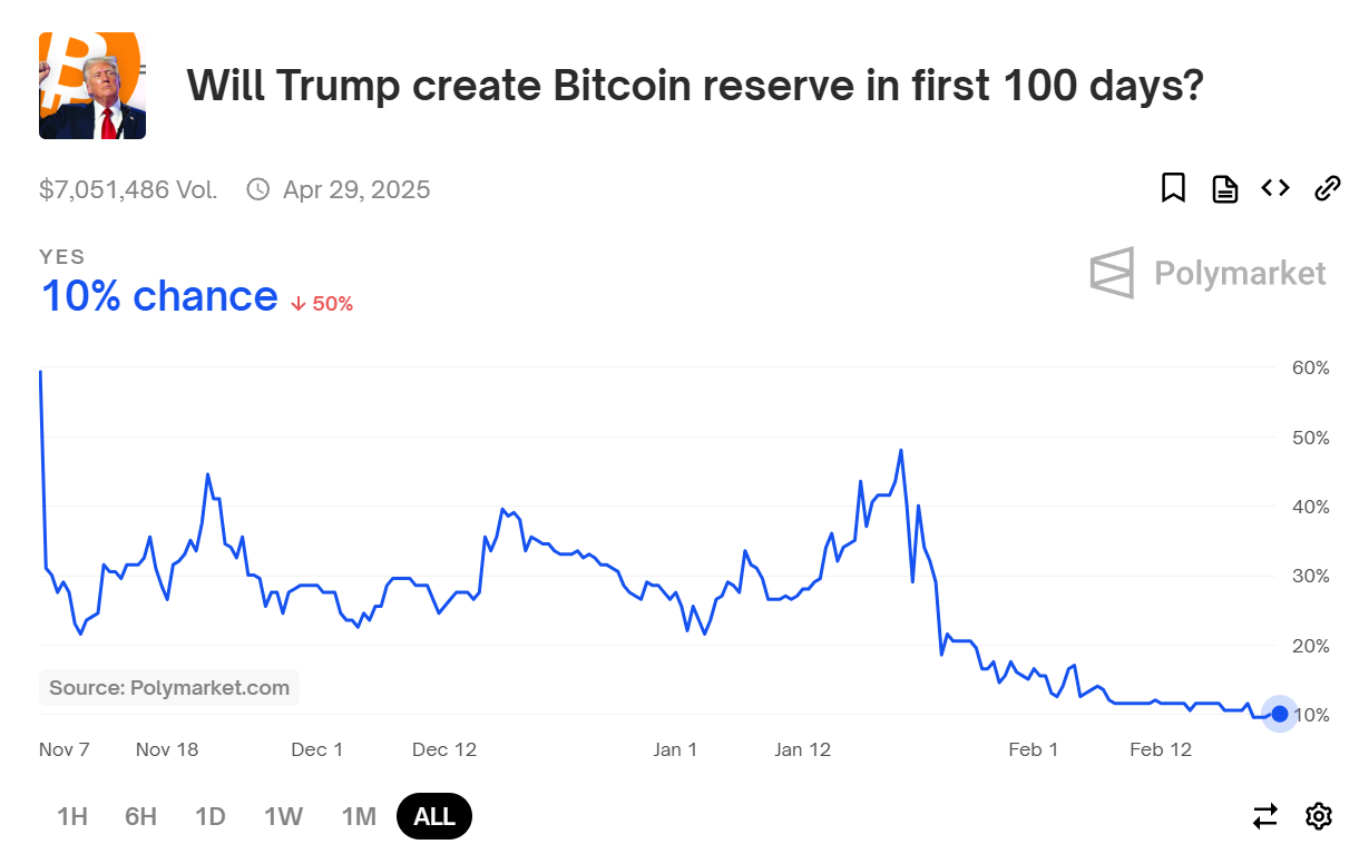 Polymarket 上预测“特朗普在上任 100 天内建立比特币储备”的概率降至 10%
