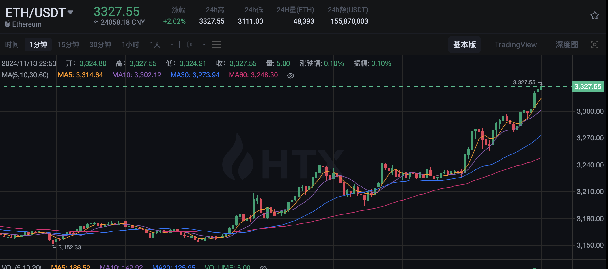 深潮 TechFlow 消息,据 HTX 行情数据,ETH 突破 3300 美元,现报 3326.11 美元,24 小时涨幅 1.97%。