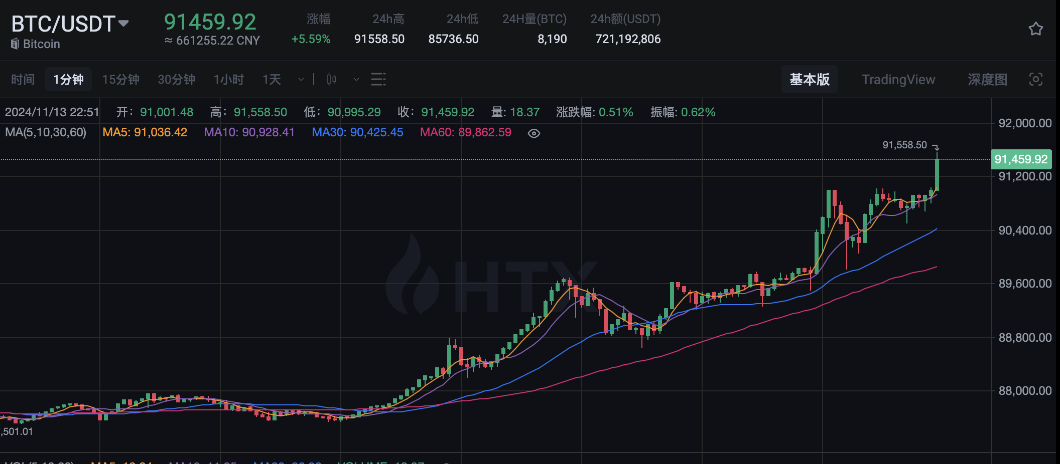深潮 TechFlow 消息,据 HTX 行情数据,比特币突破 91,000 美元,再创历史新高,现报 91344.70 美元,24 小时涨幅 5.45%。