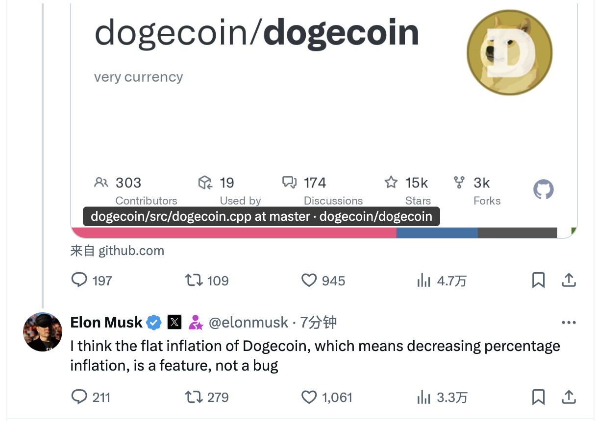 马斯克:狗狗币的固定通胀率是一项特性而非缺陷