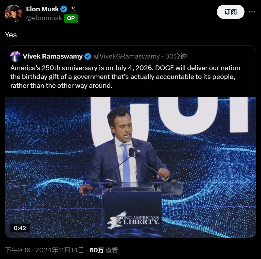 久币网 消息,11 月 14 日,政府效率部(D.O.G.E)负责人 Vivek Ramaswamy 在 X 平台发文表示,“2026 年 7 月 4 日是美国建国 250 周年。DOGE 将为我们的国家送上一份生日礼物:一个真正对人民负责的政府。”特斯拉 CEO 马斯克转发并表示支持。