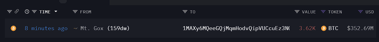 Mt. Gox 地址向两个地址转出 3620 枚比特币,约合 3.5269 亿美元