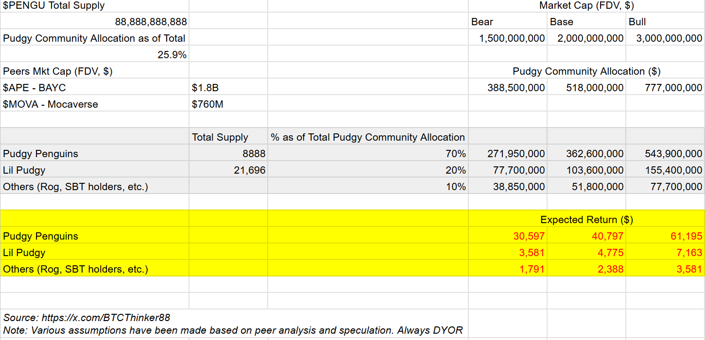 分析显示,PENGU 代币总供应量为 888.88 亿枚,其中社区分配比例为 25.9%。按照市值预估(FDV),熊市情况下为 15 亿美元,基准情况为 20 亿美元,牛市情况下为 30 亿美元。对标项目包括市值 18 亿美元的 BAYC 代币 APE 和 7.6 亿美元的 Mocaverse 代币 MOCA。