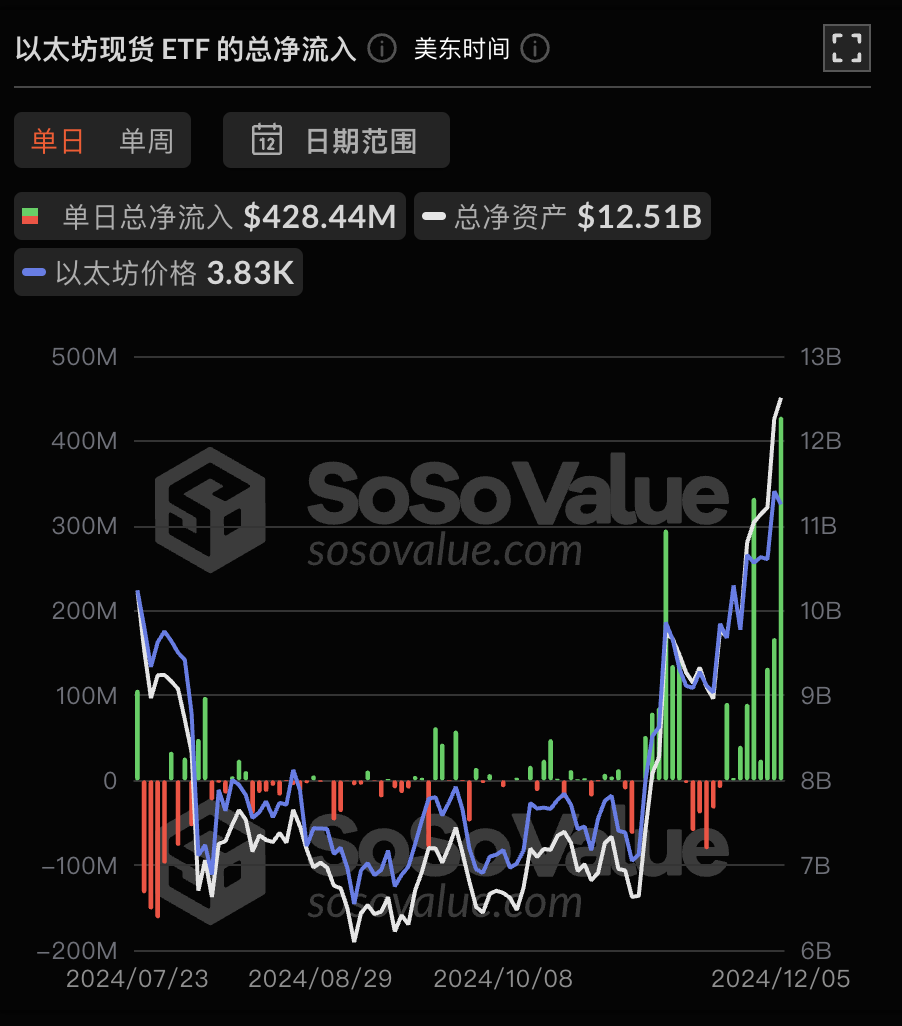 以太坊现货 ETF 昨日总净流入 4.28 亿美元,达到历史新高