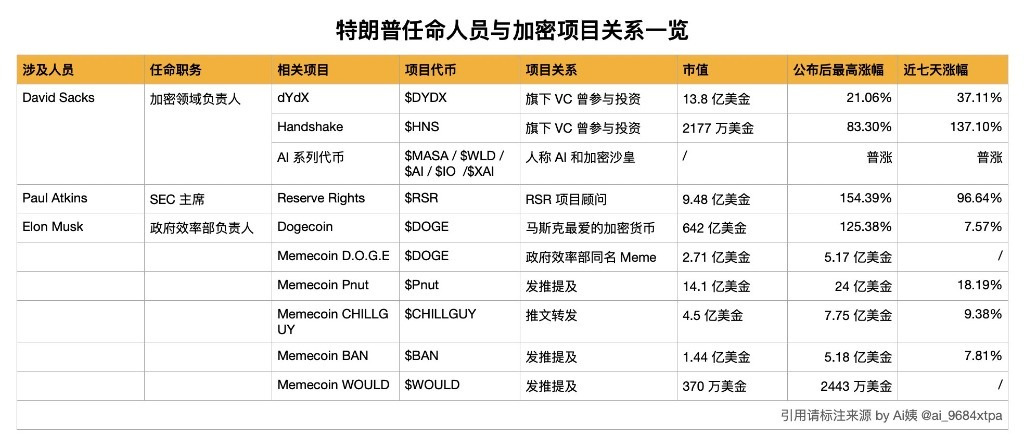 久币网 消息,12 月 6 日,据 @ai_9684xtpa 监测,特朗普上任前的一系列任命引发“顾问行情”,任命人员关联的加密项目录得显著涨幅。其中,AI 和加密领域负责人 David Sacks 旗下 VC 曾参与投资的 dYdX(DYDX)和 Handshake(HNS)分别录得 37.11% 和 137.10% 的最高涨幅,AI 系列代币(包括 MASA、WLD、AI、IO、XAI)普涨;