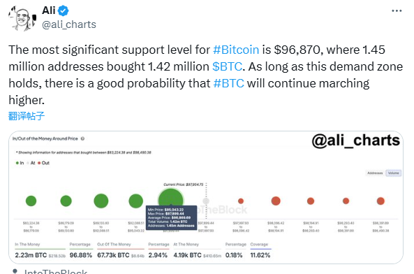 久币网 消息,12 月 6 日,加密分析师 Ali 在社交媒体上发文表示,96870 美元是 BTC 最重要的支撑位,其中 145 万个地址持有 142 万枚 BTC,只要 BTC 守住该位置价格,就很有可能继续走高。