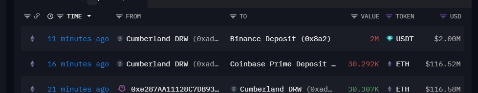 Cumberland DRW将 3.02 万枚 ETH 转至Coinbase Prime,约合 1.16 亿美元