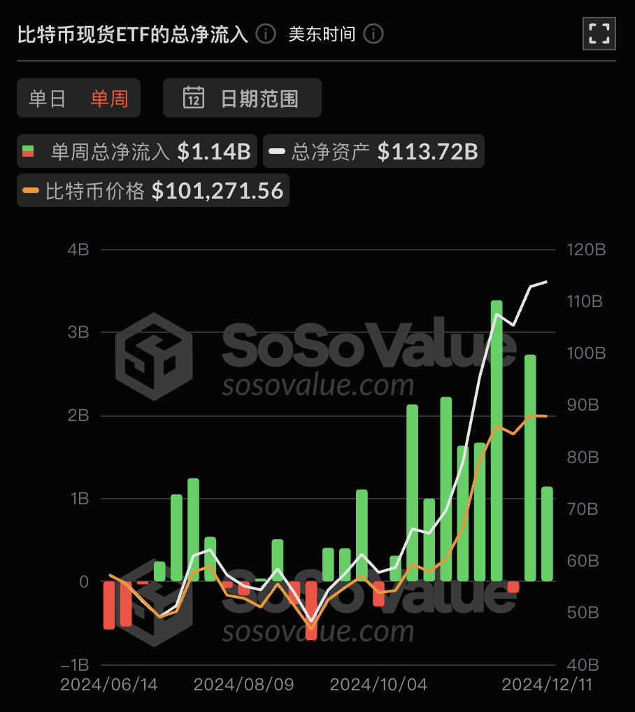 截止发稿前,比特币现货 ETF 总资产净值为 1137.17 亿美元,ETF 净资产比率(市值较比特币总市值占比)达 5.67%,历史累计净流入已达 345.76 亿美元。