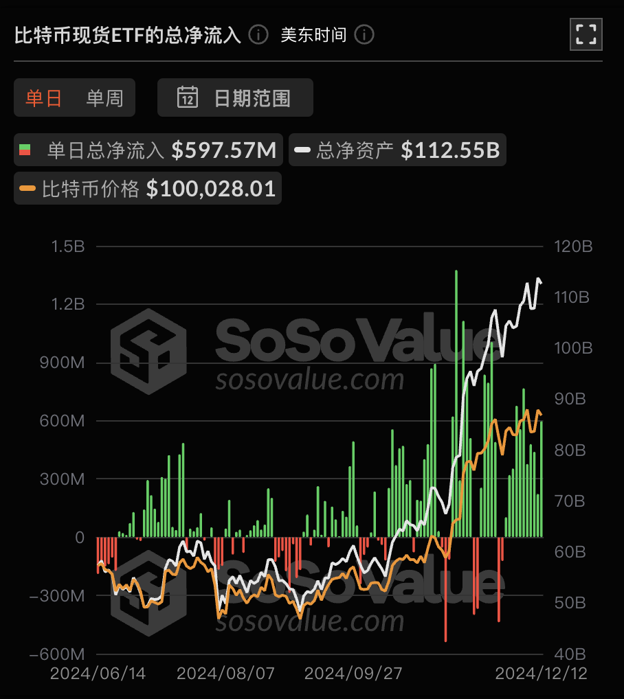 久币网 消息,根据 SoSoValue 数据,昨日(美东时间 12 月 12 日)比特币现货 ETF 总净流入 5.98 亿美元。