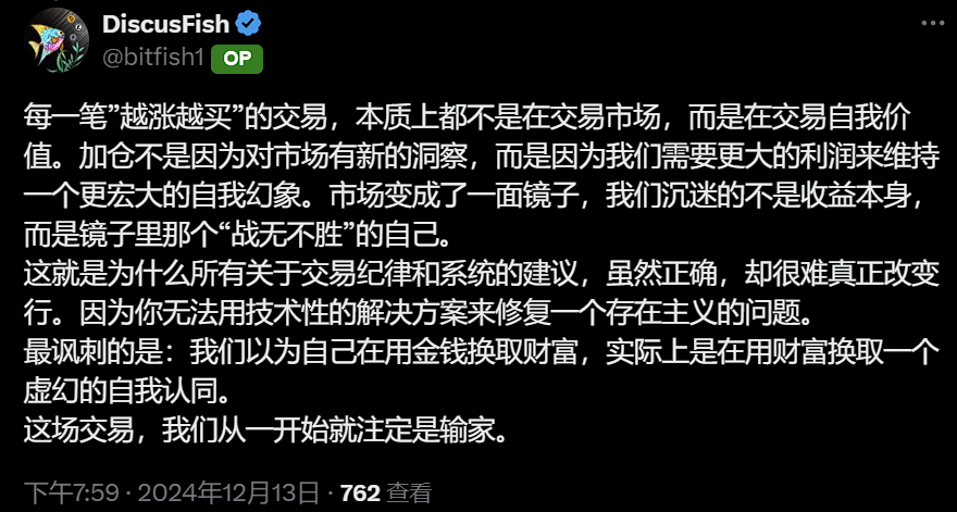 久币网 消息,12 月 13 日,神鱼在 X 平台发文表示,“每一笔‘越涨越买’的交易,本质上都不是在交易市场,而是在交易自我价值。加仓不是因为对市场有新的洞察,而是因为我们需要更大的利润来维持一个更宏大的自我幻象。市场变成了一面镜子,我们沉迷的不是收益本身,而是镜子里那个‘战无不胜’”的自己。