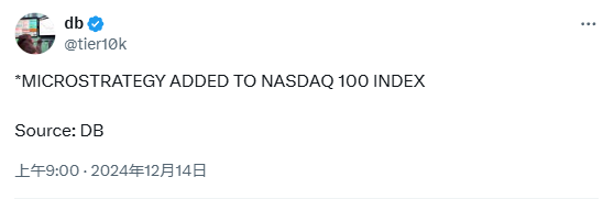 久币网 消息,12 月 14 日,据db报道,MICROSTRATEGY 被纳入纳斯达克 100 指数。