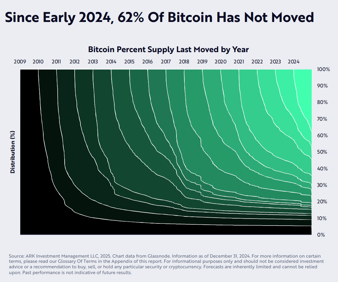 数据:62% 比特币超一年未移动,ARK 投资看涨比特币长期持有行为