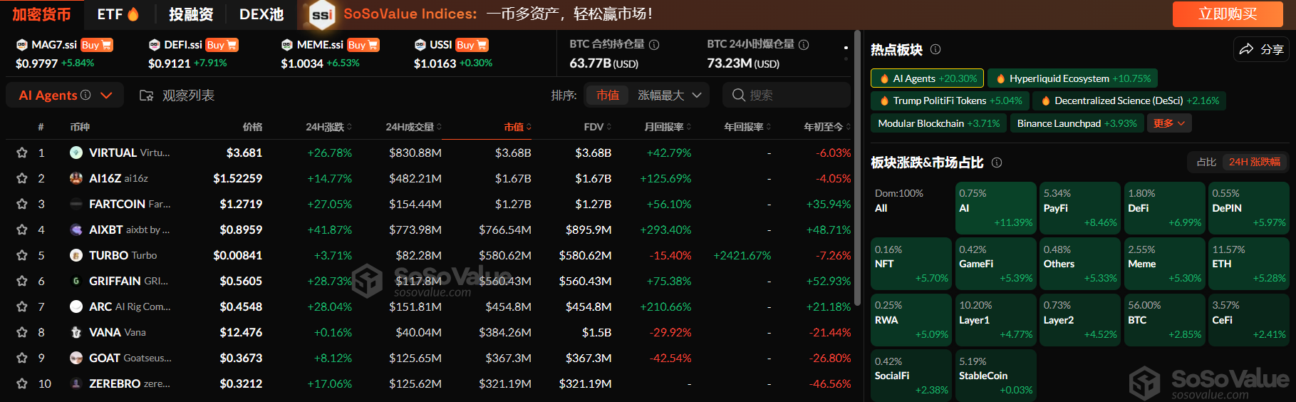 加密市场板块持续上涨,AI Agents 涨幅高达 20.30%